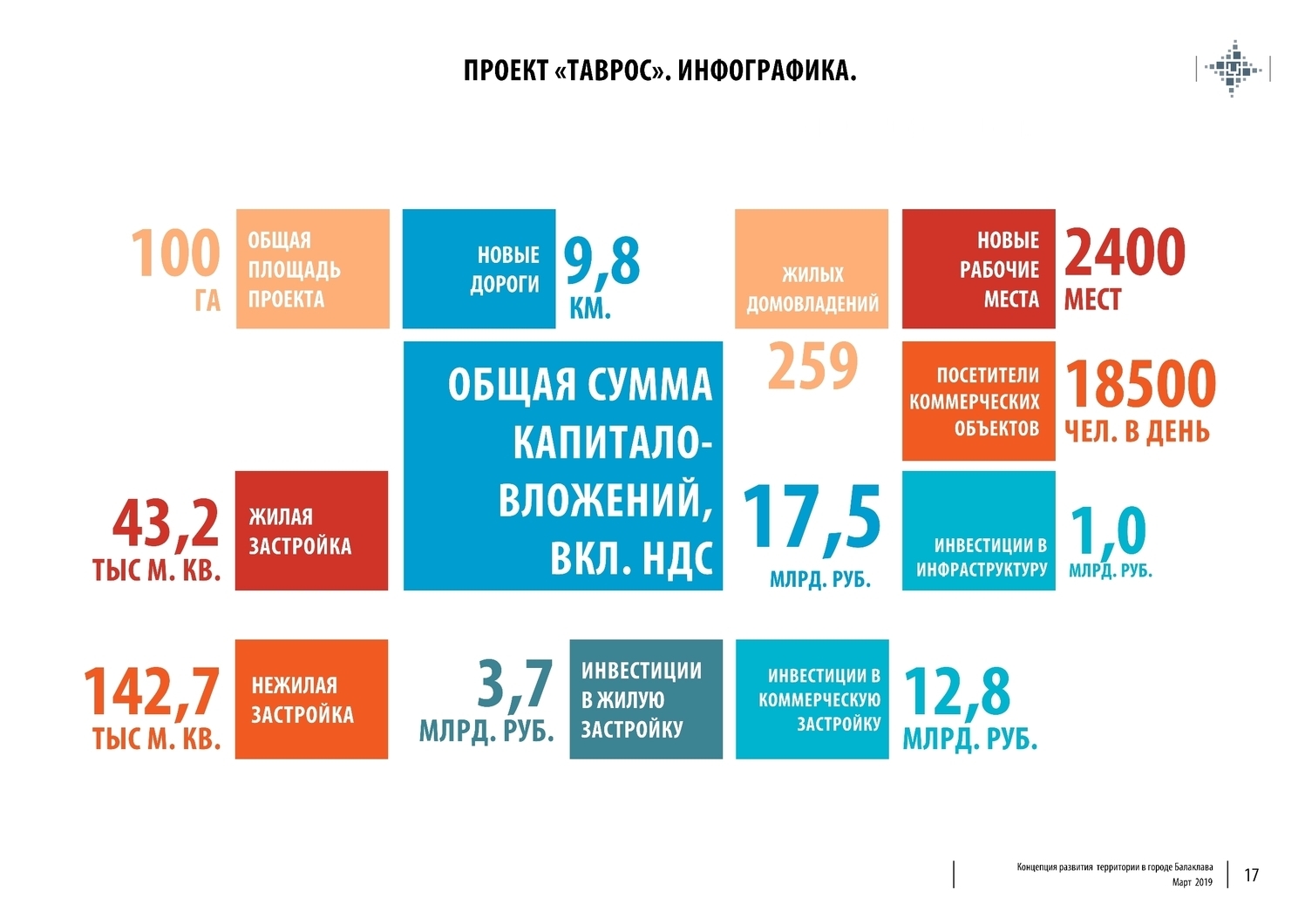 В общей сложности проект развития ЗБК предполагает строительство 143 тыс. кв. м нежилой и 43 тыс. кв. м. жилой недвижимости, общий объём частных инвестиций – 14 млрд. руб.(с рентабельностью выше средней), государственных (в объекты инфраструктуры) – 3.6 млрд. руб. (20%).